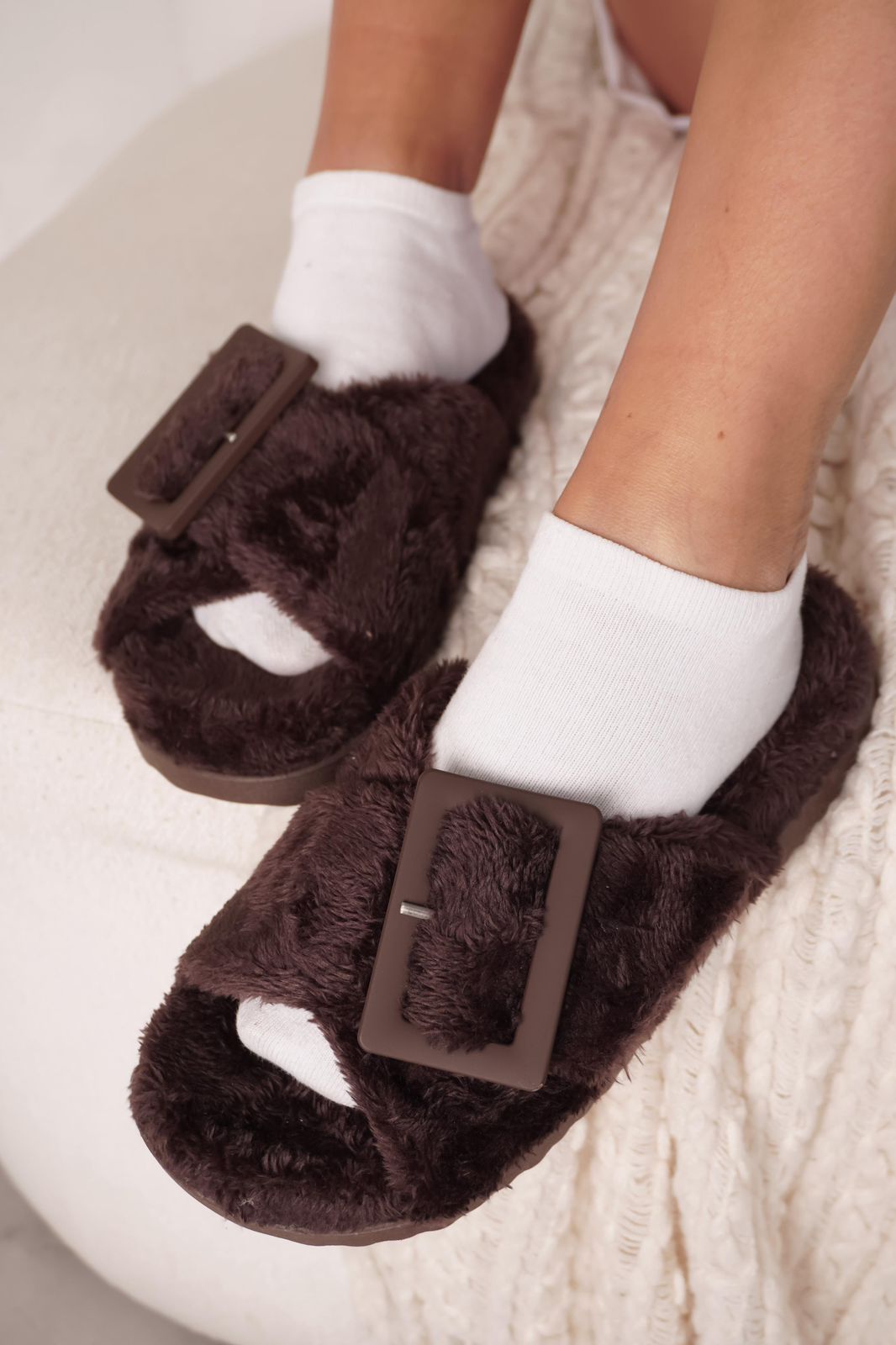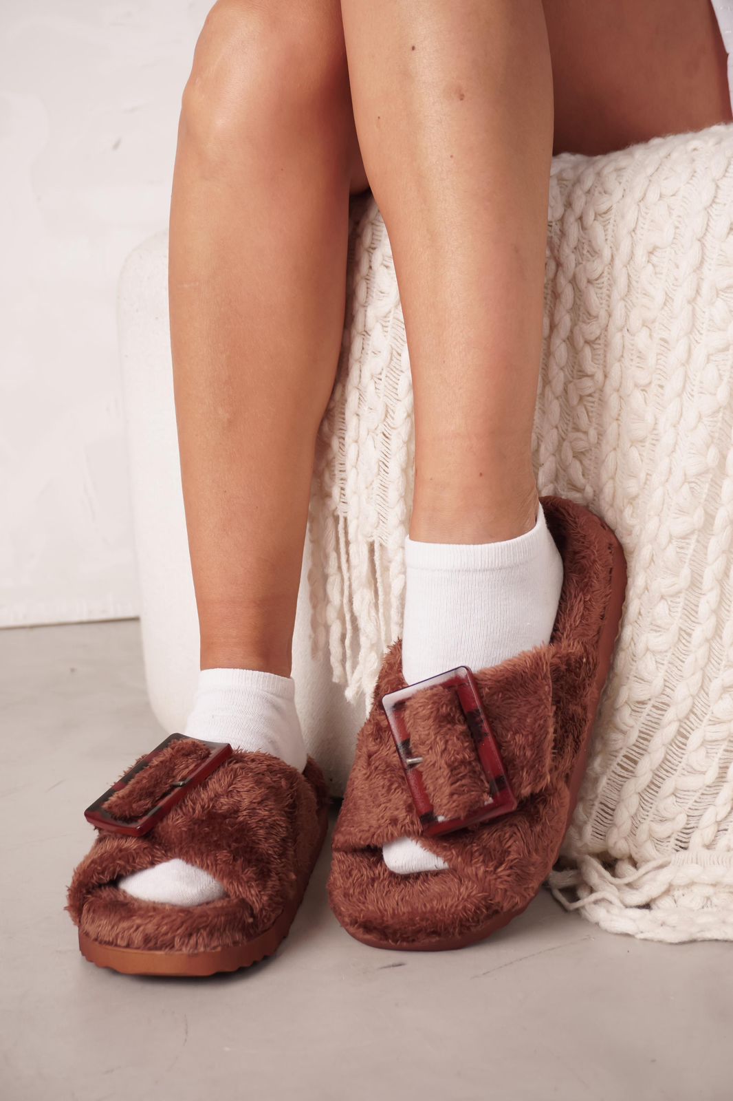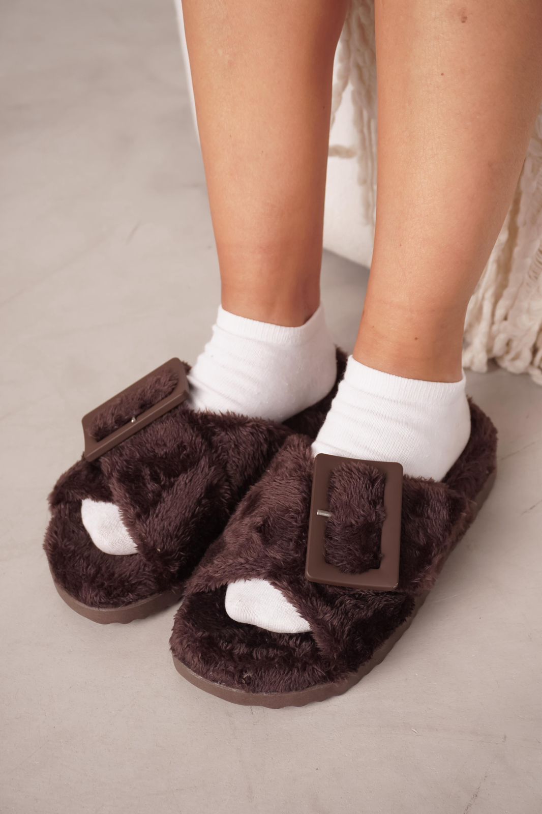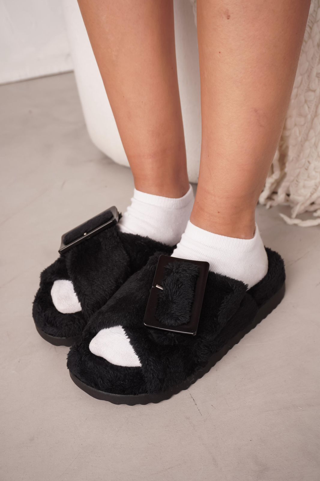 DETALLE: Ojotas de pelo ultra suave con hebilla protagonista que elevan el look sin perder comodidad.