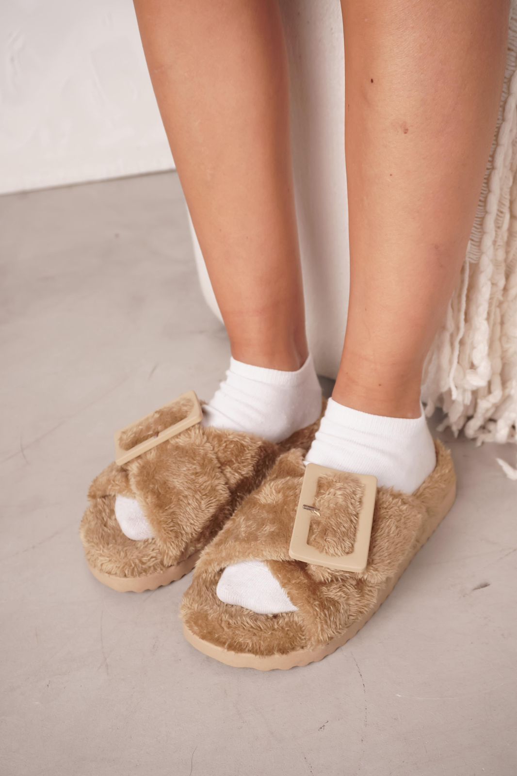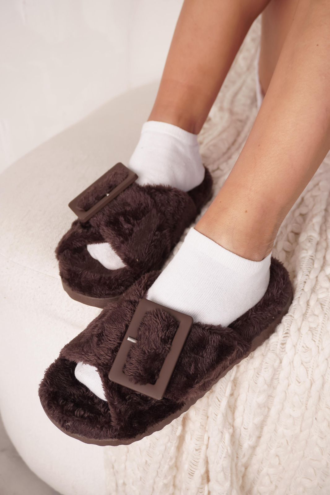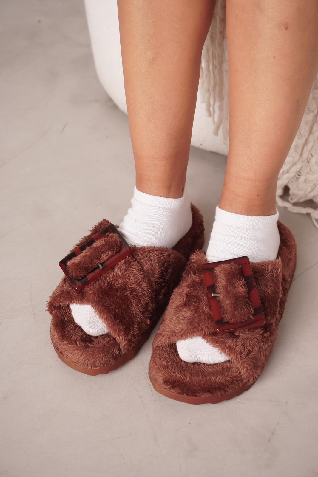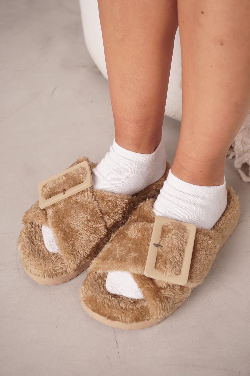 DETALLE: Ojotas de pelo ultra suave con hebilla protagonista que elevan el look sin perder comodidad.